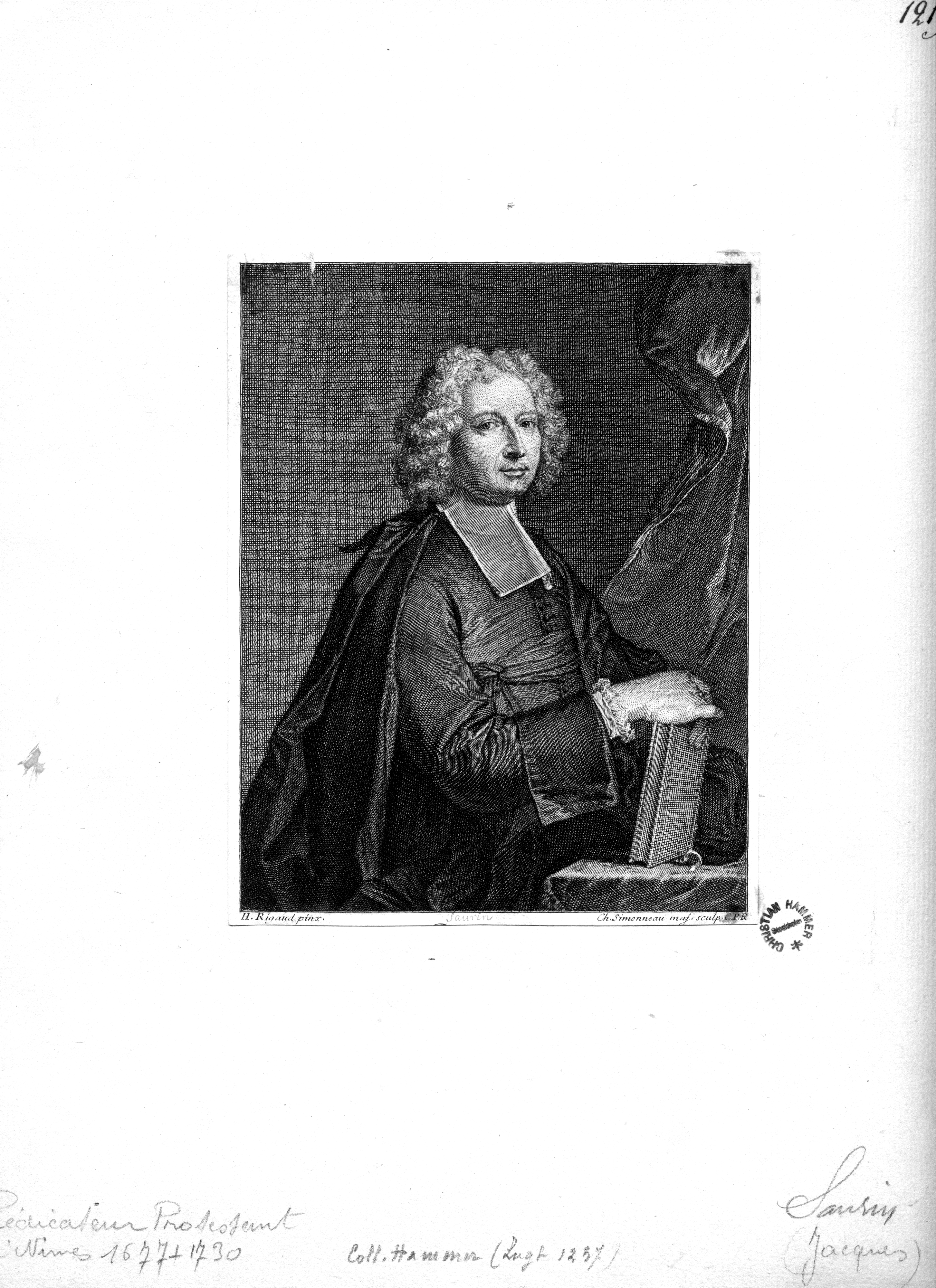 Il y a quelque temps, j’ai pu acheter, à vil prix, une gravure de la collection Christian H. Hammer (1818-1905), joaillier de la Cour suédoise. Il est connu pour avoir possédé le violon Stradivarius portant son nom. La gravure de Ch[arles] Simmoneau (1645-1728) d’après un portrait de H[yacinthe] Rigaud (1659-1743) montre un jeune pasteur ; une inscription à la main précise que c’est Jacques Saurin.